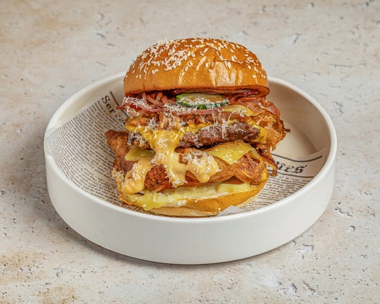 Juicy beef patty, pulled piggy, crispy chicken patty, Triple X cheese, bacon, egg, caramelized onion, pickles, BBQ sauce, and piggy mayo.