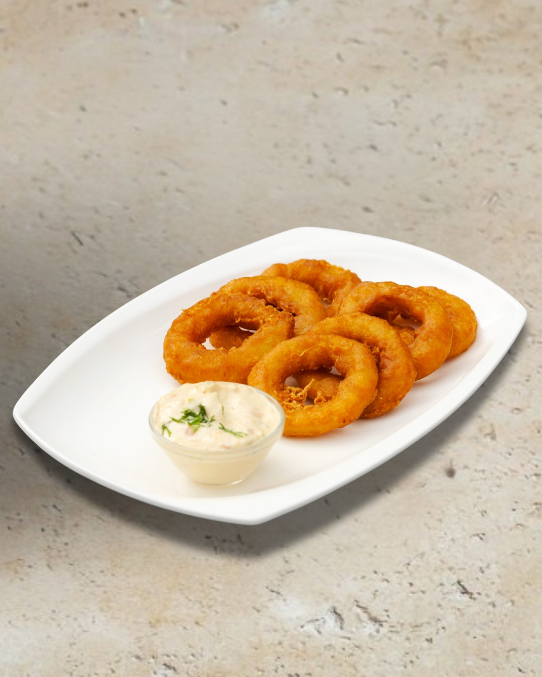 Three golden-battered calamari rings crispy on the outside, tender squid inside, and perfectly seasoned.