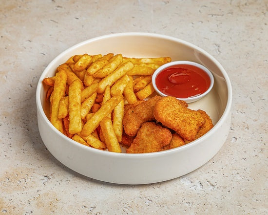 Chicken nuggets served with fries. Comes with sauce.