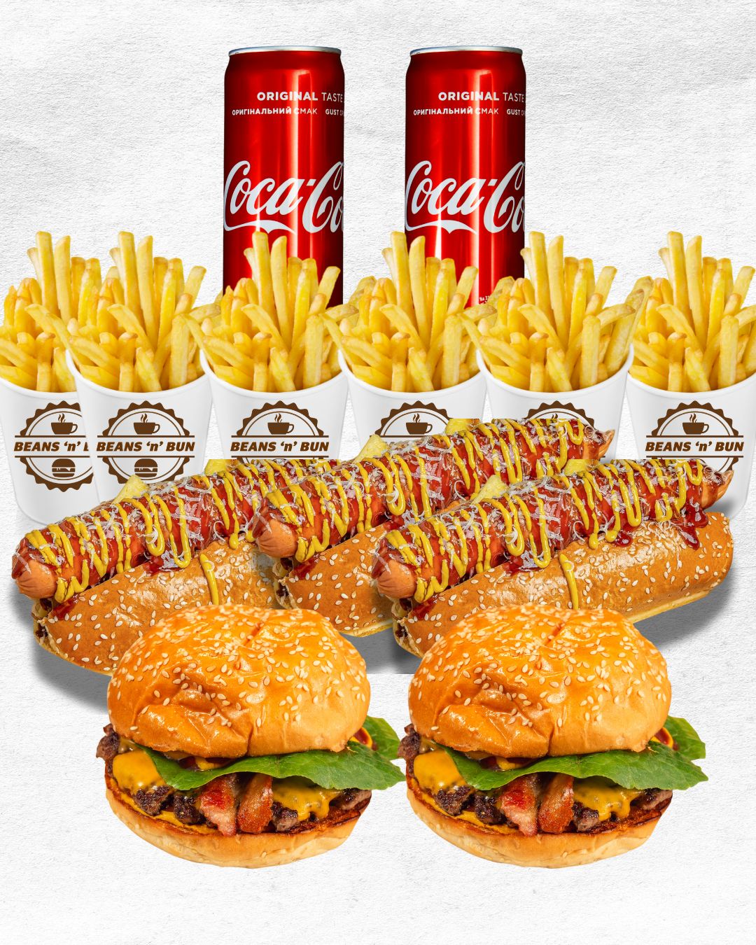 2 kiss my burger , 3 simple dog, 2x chips, 6 pcs fried wings , 2 soft drinks.