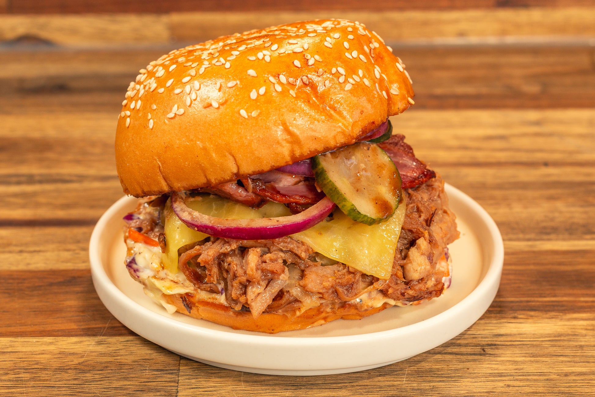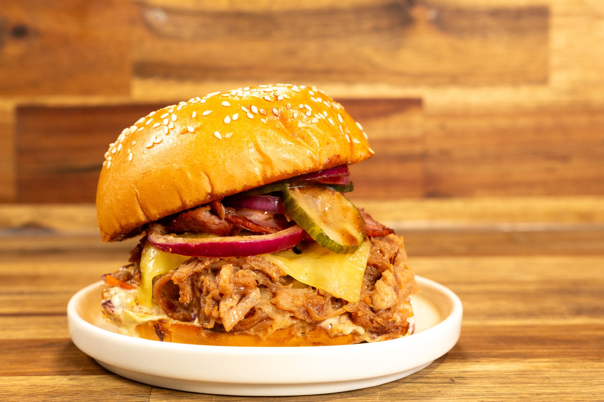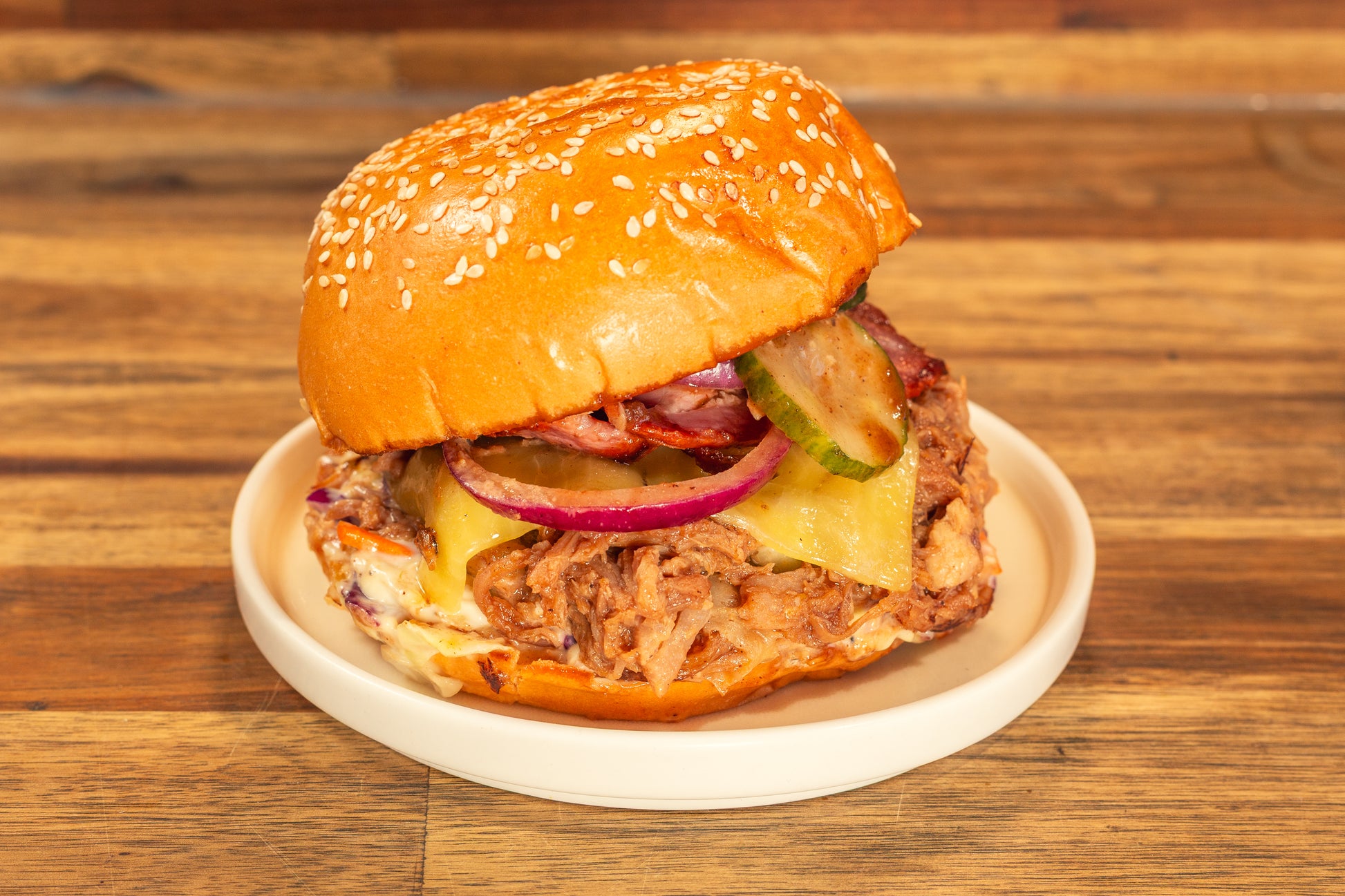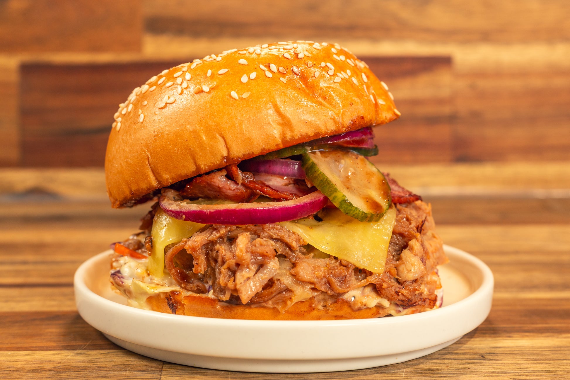 Slow-cooked pulled pork topped with melted cheese and smoky BBQ sauce.