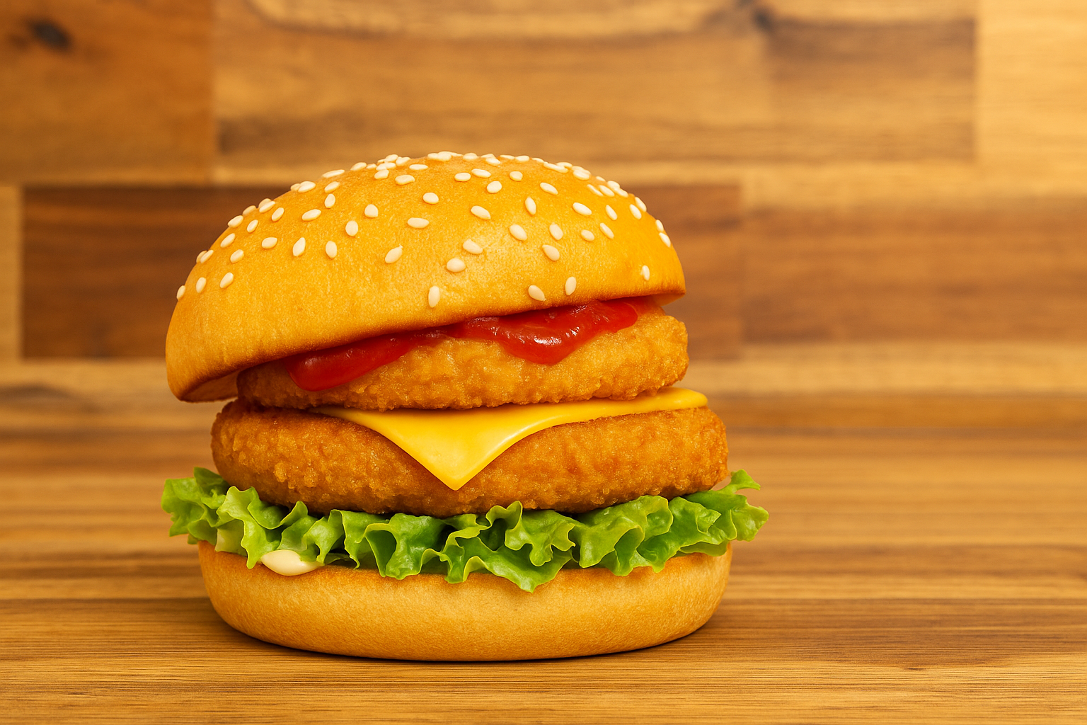 Crumbed veggie patty layered with cheese, garlic aioli, sriracha mayo, pickles, onion, and fresh lettuce.